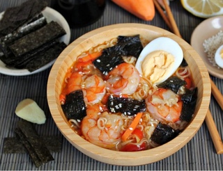 Рамен с креветками Ингредиенты:Креветки тигровые — 8–10 шт.Показать полностью…Морковь — 1 шт.Перец болгарский — 1 шт.Перец острый — по вкусуИмбирь — 1 по вкусуЧеснок — 2–3 зубчиковЛапша рамен — 150 гЛисты водорослей нори — 1–2 шт.Масло подсолнечное — 2–3 ст. л.Соевый соус — 2 ст. л.Сахар — 1 щепоткаЯйцо — 1 шт.Приготовление:1. В сотейник или сковороду наливаем подсолнечное масло и разогреваем. Добавляем нарезанные небольшими кусочками имбирь и чеснок.2. Морковь режем тонкой соломкой и высыпаем в сковороду. Все перемешиваем и готовим на сильном огне пару минут.3. Добавляем тонко нарезанный болгарский и острый перец. Продолжаем готовить помешивая.4. Наливаем соевый соус и добавляем немного сахара. Когда овощи стали мягкие, добавляем очищенные тигровые креветки и обжариваем их минуту. Налить кипяток и добавить лапшу рамен. Суп убираем с огня.5. Суп наливаем в порционные тарелки, кладем по половинке яйца и добавляем водоросли нори.Приятного аппетита!Автор: Natali#супы@bon